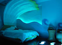 | 貝殼床。很愛牆上彩繪的藍色海浪。關上主要燈源後,是一片藍。 |